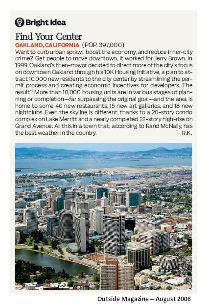 In its August issue, Outside touts our urban renewal progress. The article points to the housing units and restaurants built. If you build it, then they will come. (Yes, this doesn’t just apply to baseball diamonds built in cornfields.) In Oakland, folks are starting to be drawn back to the urban core.