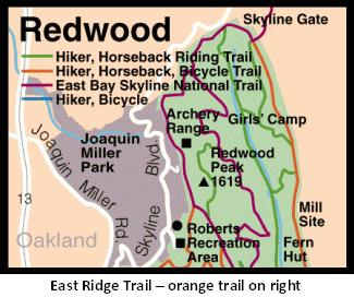2009 Update: Starting September 8th, the East Ridge Trail will be closed from 8am – 5pm weekdays. The closed portion runs between Skyline Gate and Prince Trail, where East Bay Parks says they are removing hazardous tree debris and diseased Monterey Pines. This work is expected to wrap up by December, and you can read more here.