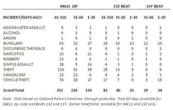 For the whole 94611 zip code, there’s no question things have gone awry. Last time we looked, there were 43 burglaries in a three month period (early May- early August). In the past two months, there were already 49 hits.