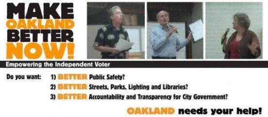 The next ninety days are going to be important, busy and exciting. We need as many folks as possible to pitch in and help. If you’d like to be more involved in any of the three areas (public safety, government transparency/accountability or public works), or in support (events, outreach, publicity, etc.), then e-mail: Oaklanders@makeoaklandbetternow.org. And there’s always more information available at www.makeoaklandbetternow.org. Please join us – Oakland needs you.