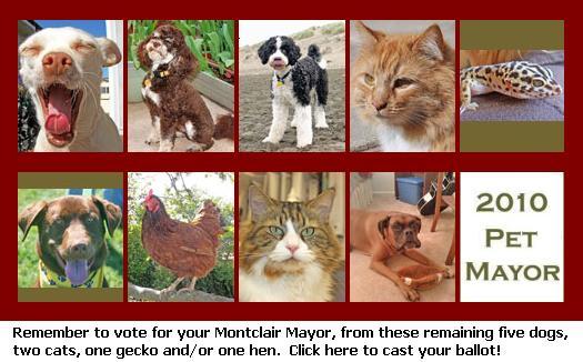 Montclarion remain open-minded, supporting mainstream as well as fringe candidates.  There are different species running to the finish, but we’re not convinced that our neighbors are ready for anything other than a wagging-happy canine.  Go ahead and influence the outcome by paying for your votes.