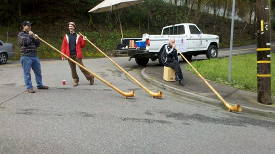 As you may know, alphorn players are unofficially part of Oakland’s Running Festival experience. After running some ten miles uphill, the marathoners are welcomed to their Montclair high-point by several Riccola-like players. We didn’t see photographic proof until now, a week later.