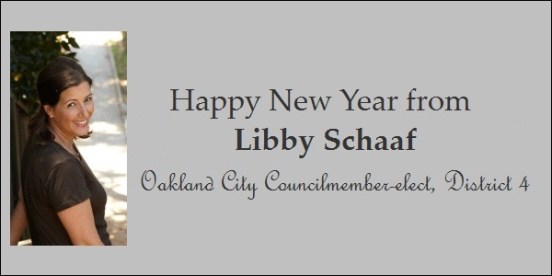 In a year-end message, incoming District 4 Rep Libby Schaaf has invited everyone to the city-wide inauguration.  All the newly elected officials, including Schaaf, will be sworn in next Monday at 11am, at the Fox Theater.  The event is free and open to Oaklanders, on a first-come, first-served basis.